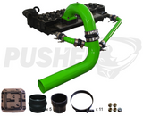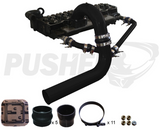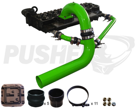 The Pusher 3.5" Mega Intake System with Cross-Air replaces all of your 3” factory post intercooler plumbing and intake manifold with 3.5” mandrel bent tubing, heavy duty 4-ply silicone couplers and stainless T-bolt clamps. So why the extra .5”?